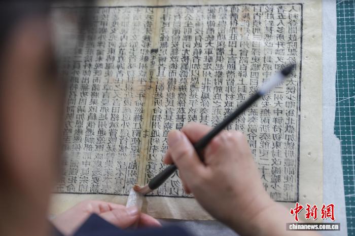 图为4月10日,罗红在修复古籍书叶时,用薄皮纸对书口进行加固。罗红始终在努力提高自己,修复中遇到问题便会查阅资料文献,定期和同行交流取经。刘力鑫 摄