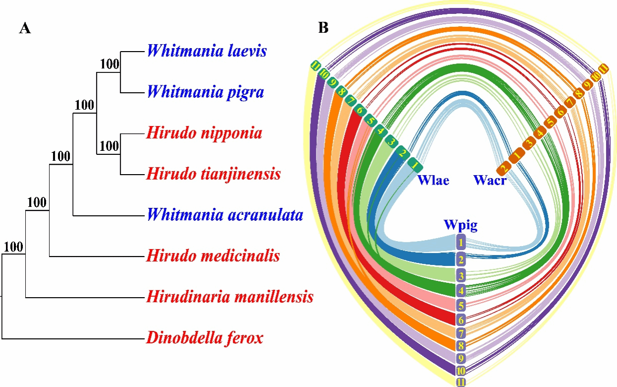 我国有3种金线蛭属物种,其中宽体金线蛭和尖细金线蛭是药用水蛭的基原物种,被列入《中华人民共和国药典》,而光润金线蛭则不属于基原物种。然而这3种金线蛭的分布区有许多重叠,严重影响相关药材的科学合理利用。本研究对尖细金线蛭和光润金线蛭进行全基因组测序,结合之前发表的宽体金线蛭基因组数据,开展种间比较。结果发现,3种金线蛭染色体数目相同,光润金线蛭的各项遗传学指标与宽体金线蛭接近,而尖细金线蛭的基因组大小、基因组复杂度、基因数量等指标都与另两种金线蛭显著不同。有趣的是,系统发育分析显示,与传统分类观点不同,3种金线蛭与医蛭属形成多系群,推测其丢失吸血属性是近期发生的进化事件。在宽体金线蛭、光润金线蛭和尖细金线蛭中分别鉴定到79、76和102个抗血栓基因,转录组分析显示,多数基因都能在组织中表达,这也解释了为什么不吸血的水蛭也有药用活性。本研究为了解非吸血型水蛭的抗血栓特征提供组学数据,也为其药材基原的合理性提供关键科学依据。井冈山大学赵芳副教授为论文第一作者,昆明学院刘子超教授和井冈山大学林恭华教授为通讯作者。