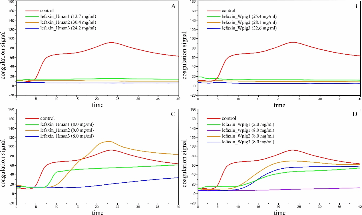 图2. A. 菲牛蛭lefaxin原液抗凝血活性; B. 宽体金线蛭lefaxin原液抗凝血活性; C. 菲牛蛭lefaxin稀释液抗凝血活性; B. 宽体金线蛭lefaxin稀释液抗凝血活性