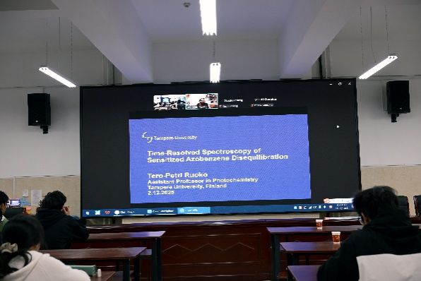 芬兰坦佩雷大学Tero-Petro Ruoko助理教授作了题为“Time-Resolved Spectroscopy of Sensitized Azobenzene Disequilibration”的报告,该团队提出通过“受限环境下敏化失衡(DESC)” 的超分子策略,将大环主体与光敏剂相结合,在水溶液体系中实现了对偶氮苯分子异构体的选择性结合与敏化,使异构化反应效率接近定量水平;且可通过任意颜色的可见光驱动偶氮苯分子光异构化转变,不仅降低了能耗,还拓展了该类分子在生物兼容性材料等对光源有特殊要求场景中的应用。Ruoko助理教授在报告中还详细介绍了通过时间分辨光谱技术对偶氮苯分子动态变化机理地研究方法。