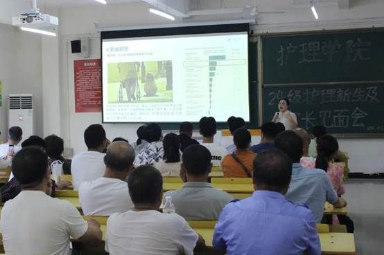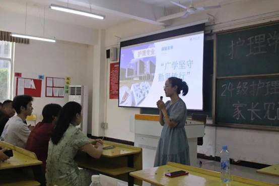 会议开始,由游睿芳向大家介绍井冈山大学护理专业,游老师从办学历程、宗旨与目标、教育计划、学生成绩评定以及职业前景五个方面入手,全方面地向家长们介绍护理专业,让家长们对这个专业有更加深刻的了解。