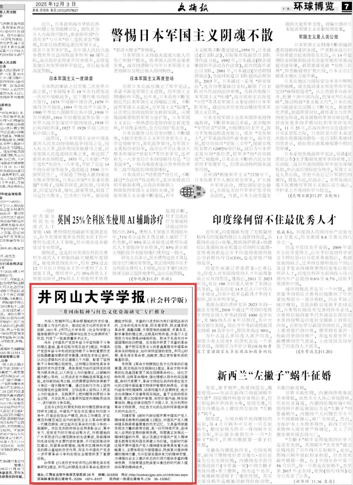 同时,《文摘报》在第7版“环球博览”还专门推介了学报社科版的特色栏目“井冈山精神与红色文化资源研究”,挑选了该栏目于2025年刊发的5篇文章进行了介绍。通过推介,学报社科版在国内外学术界的知名度得到了进一步的提升。